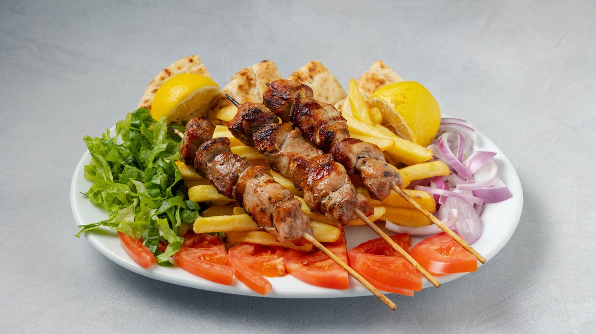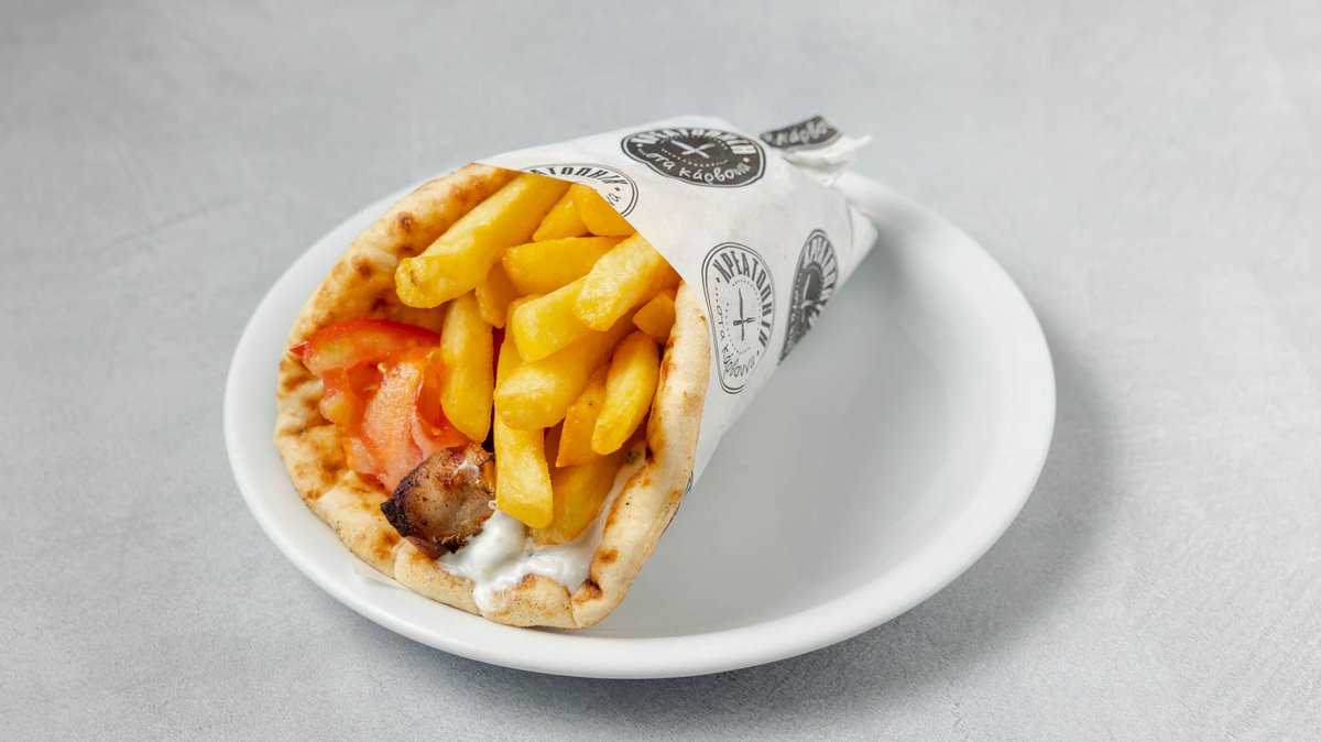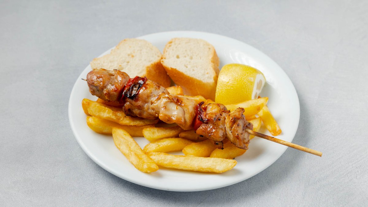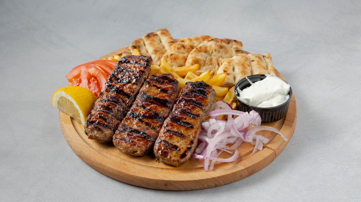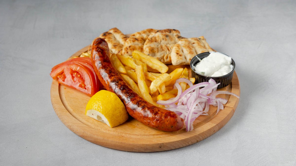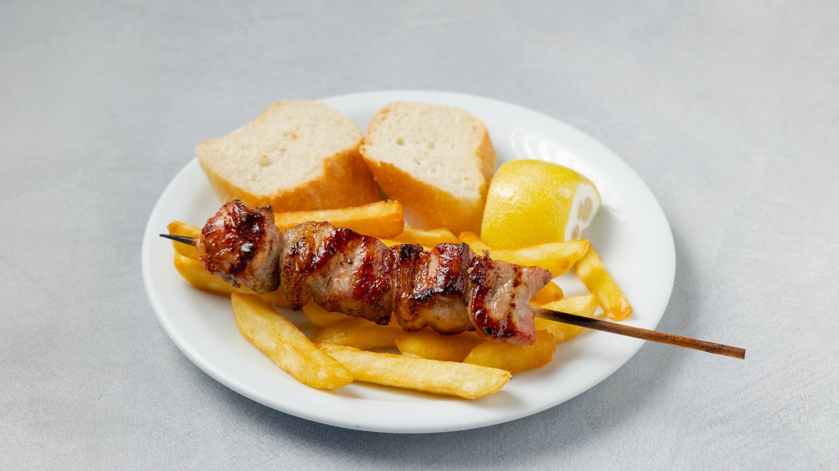 Συνοδεύεται από πατάτες τηγανητές, ντομάτα, κρεμμύδι, πίτες και τζατζίκι