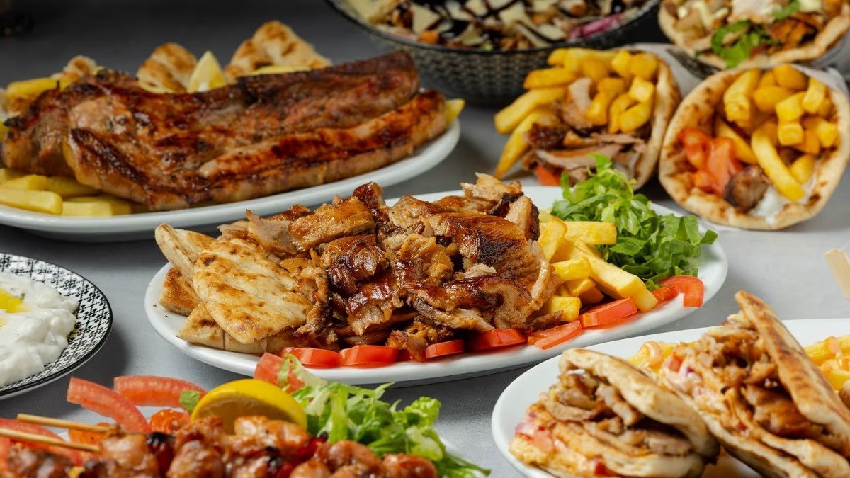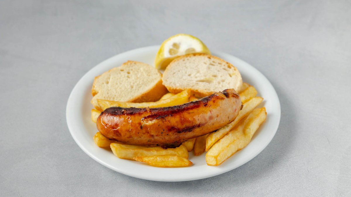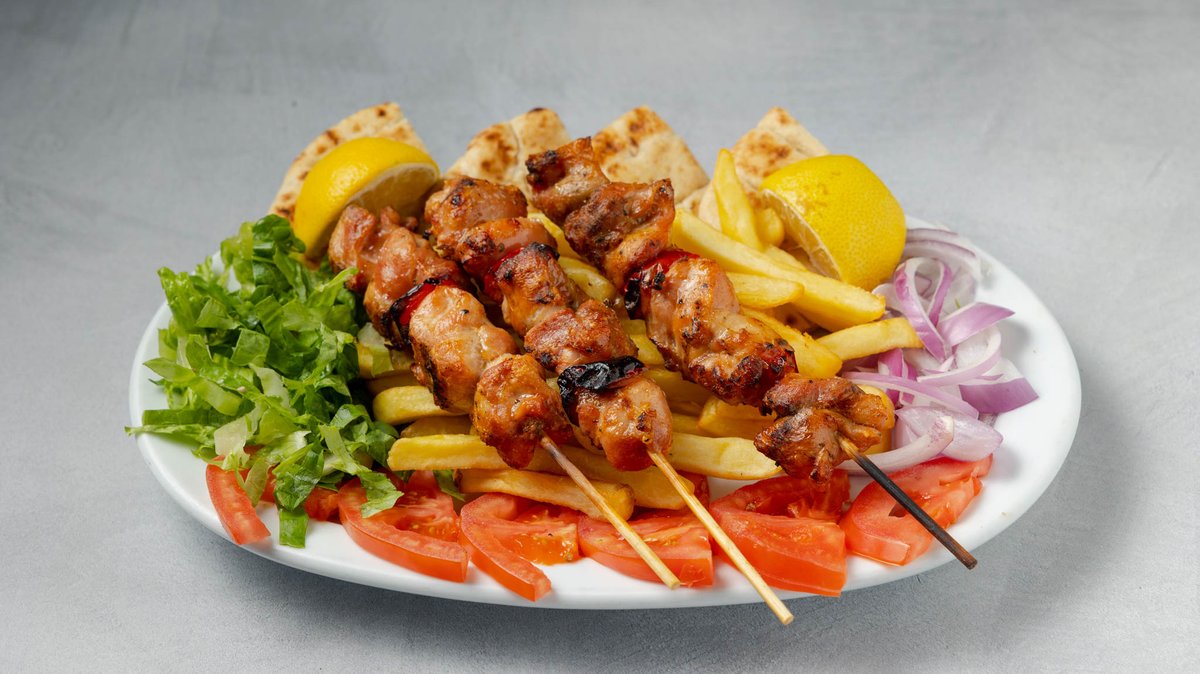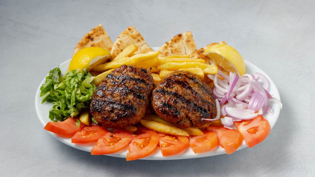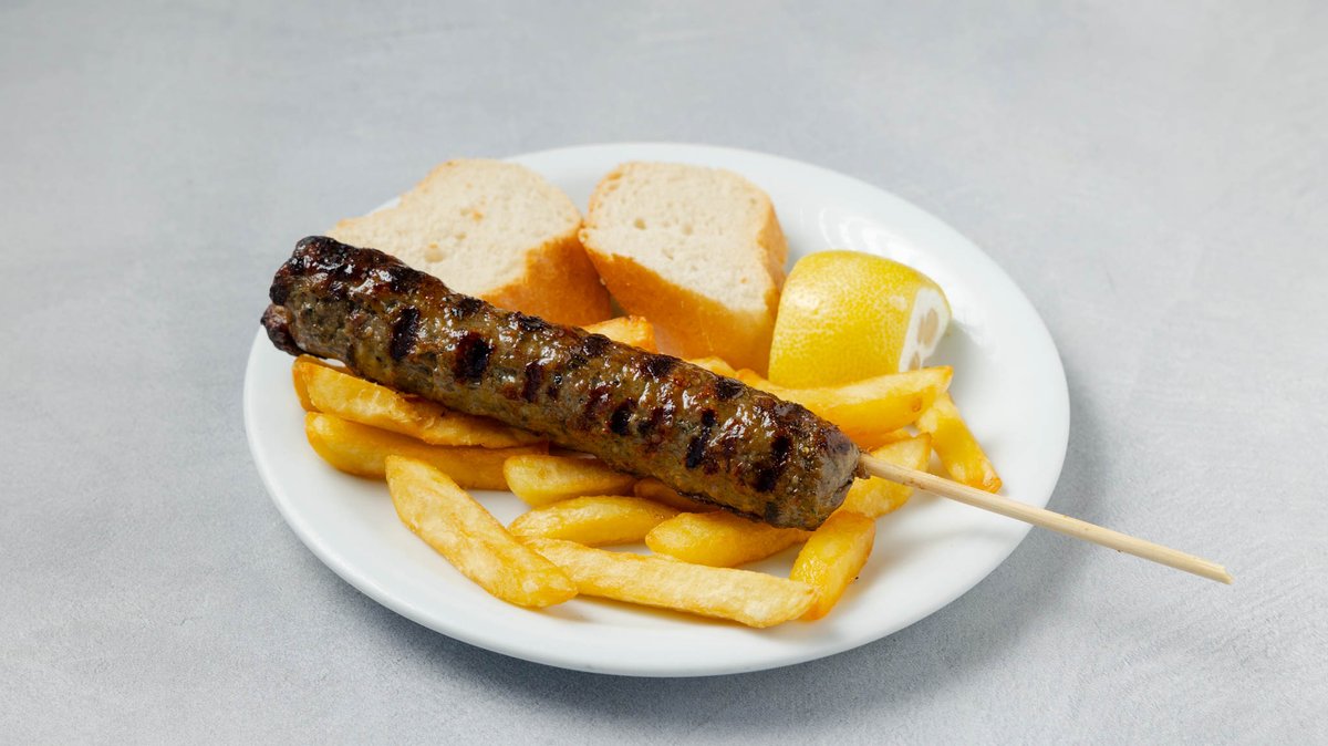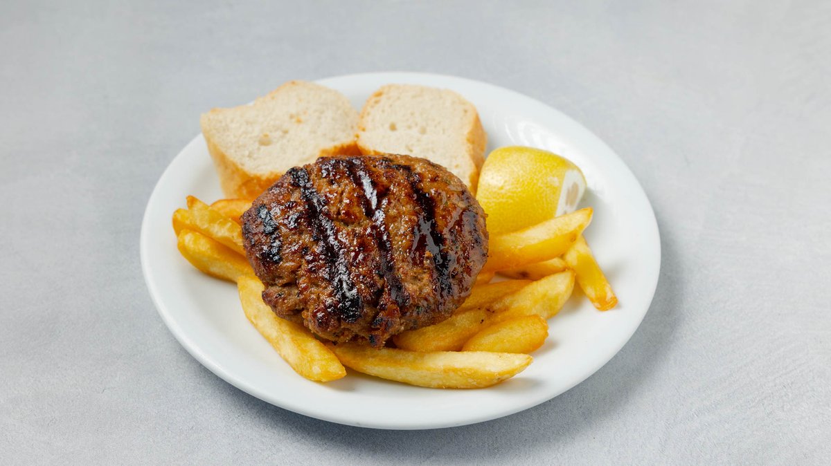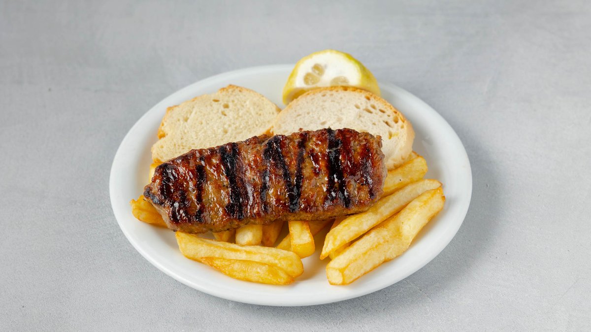 Συνοδεύεται από πατάτες τηγανητές, ντομάτα, κρεμμύδι, πίτες και τζατζίκι
