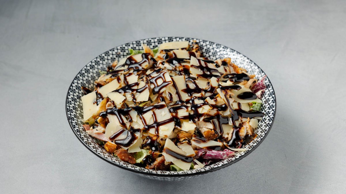Με μαρούλι, λόλα, iceberg, γύρο κοτόπουλο, κρουτόν, μπέικον, καλαμπόκι και caesar's sauce