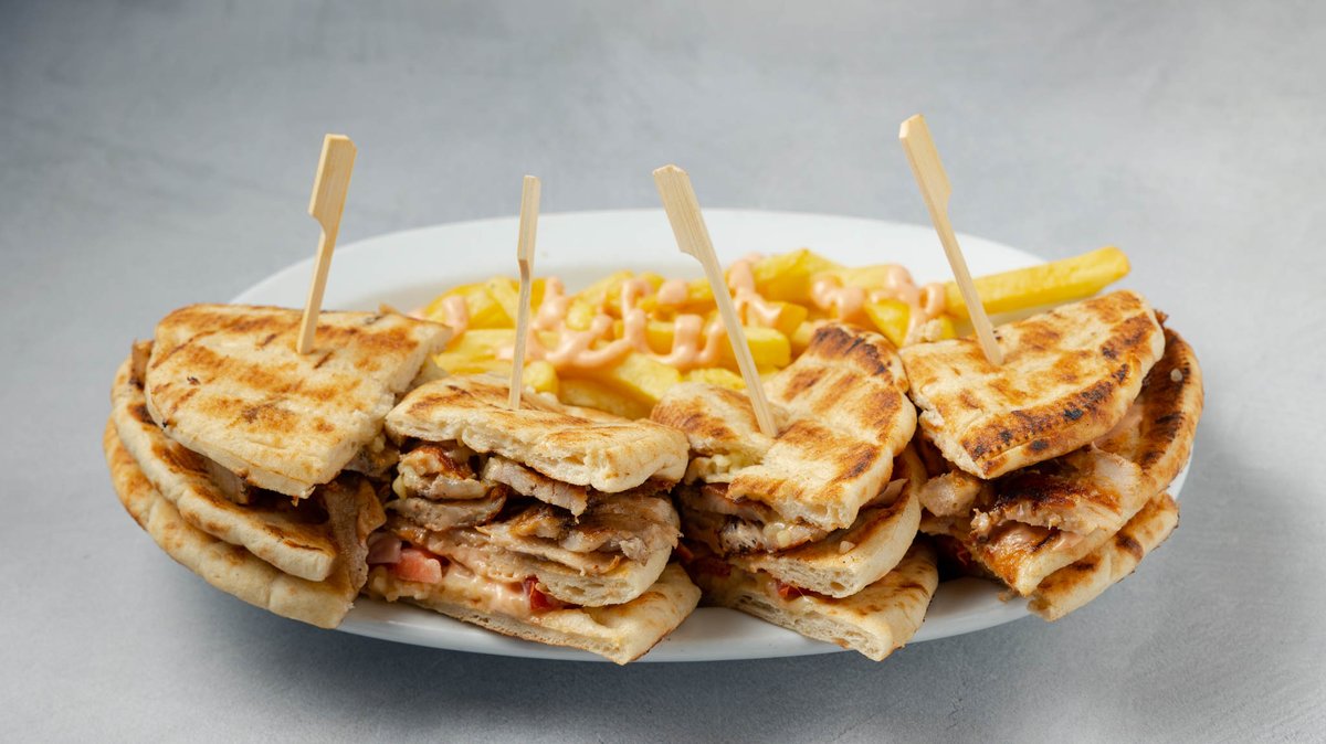 Πίτα club με γύρο κοτόπουλο και τα υλικά της επιλογής σου. Συνοδεύεται από τηγανητές πατάτες