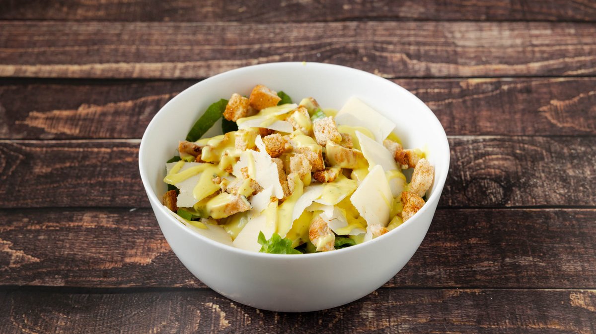 Μαρούλι, φιλέτο κοτόπουλο, παρμεζάνα, κρουτόν, καλαμπόκι, μπέικον, σως