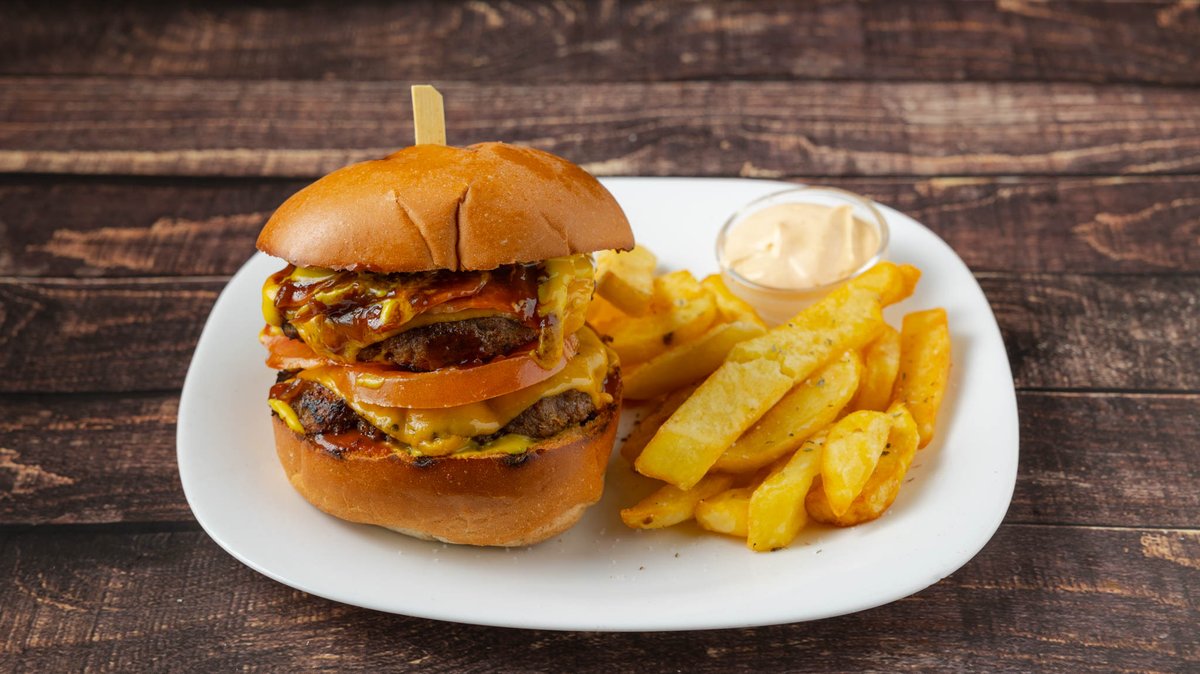 2 Μπιφτέκια, τσένταρ, ντομάτα, καραμελωμένα κρεμμύδια, μπέικον, ketchup, μουστάρδα. Συνοδεύεται απο πατάτες τηγανητές