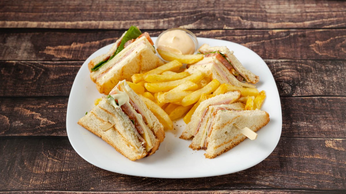 Τυρί, μαρούλι, πιπεριά, σως μουστάρδας και ντομάτα. Συνοδεύεται απο πατάτες τηγανητές