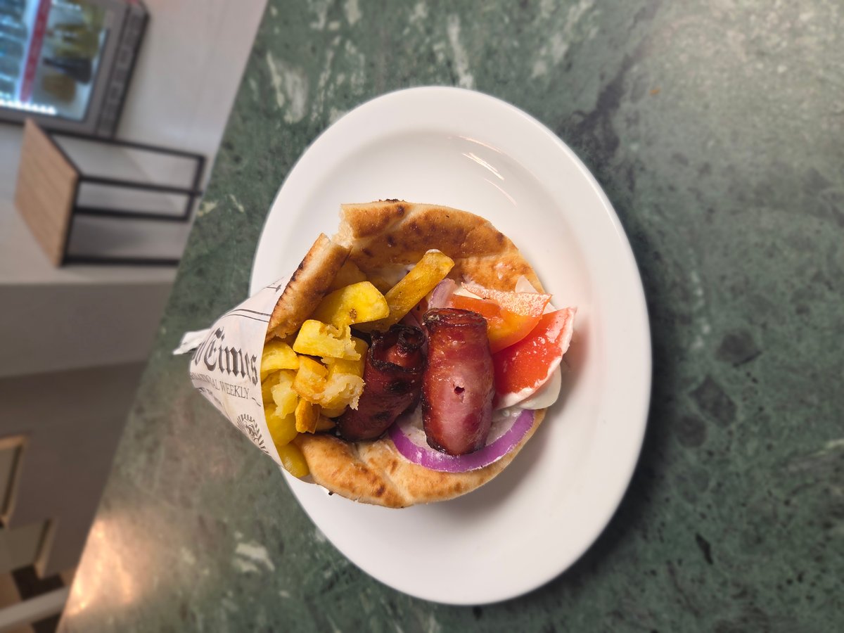 Γύρο χοιρινό ή κοτόπουλο, μουστάρδα, κρεμμύδι, ντομάτα, τυρί, πατάτες, κέτσαπ