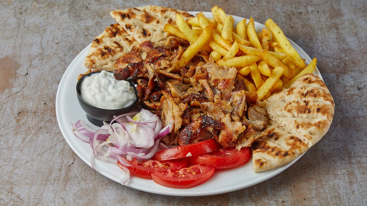 Συνοδεύεται από ντομάτα, κρεμμύδι, πατάτες τηγανητές, τζατζίκι και 2 πίτες