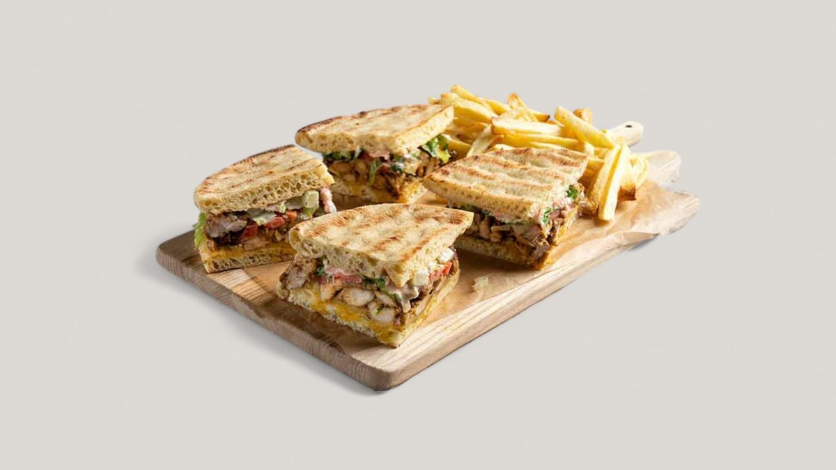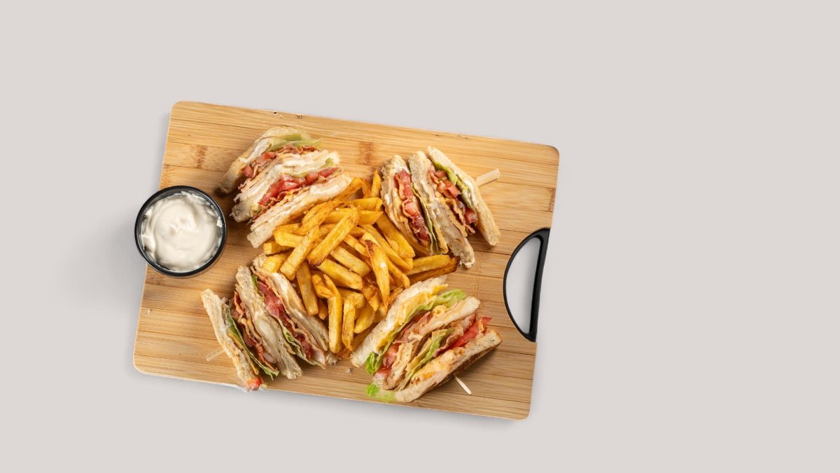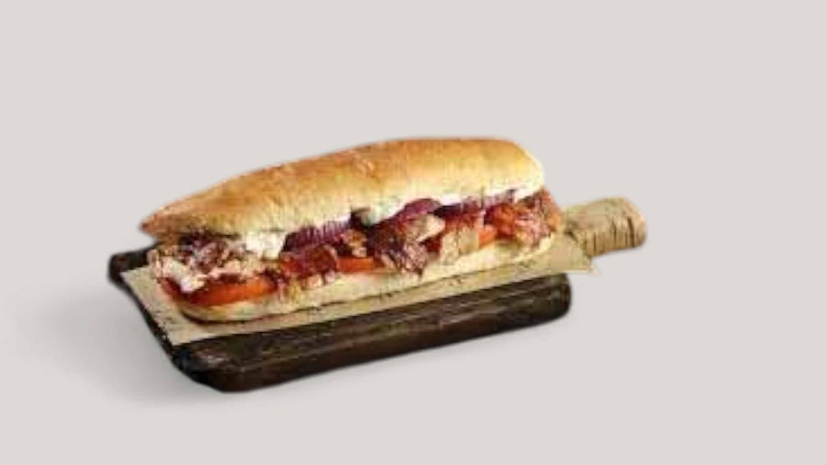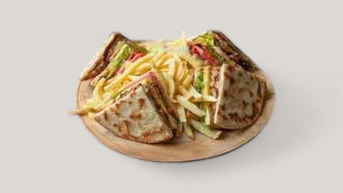 Με ζαμπόν, μπέικον, ντομάτα, μαρούλι, gouda, μαγιονέζα και σως Σεφ. Συνοδεύεται από πατάτες τηγανητές