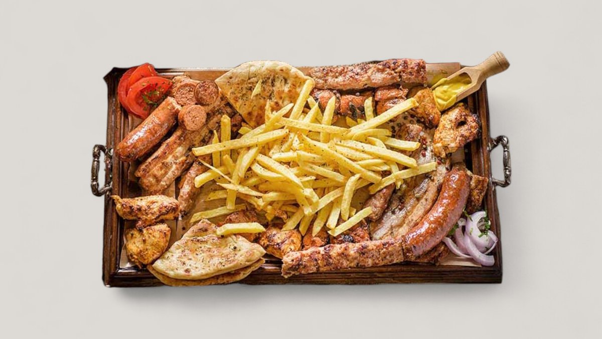 Με γύρο χοιρινό, 2 σουβλάκια χοιρινά, 2 κεμπάπ, 2 λουκάνικα χωριάτικα και 2 πανσέτες. Συνοδεύεται από πατάτες τηγανητές, πίτα και σως μουστάρδας