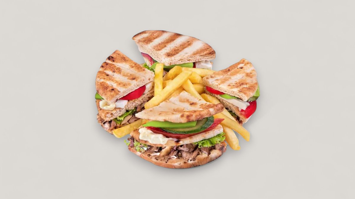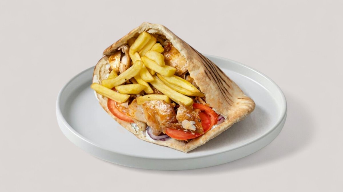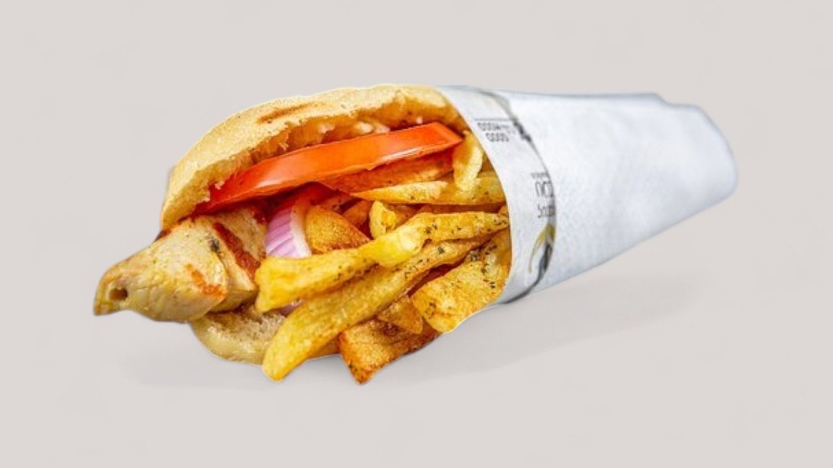 Με γύρο κοτόπουλο, ντομάτα, μαρούλι, κρεμμύδι, gouda και τζατζίκι. Συνοδεύεται από πατάτες τηγανητές