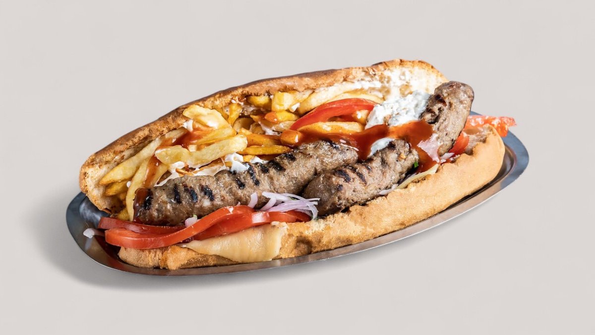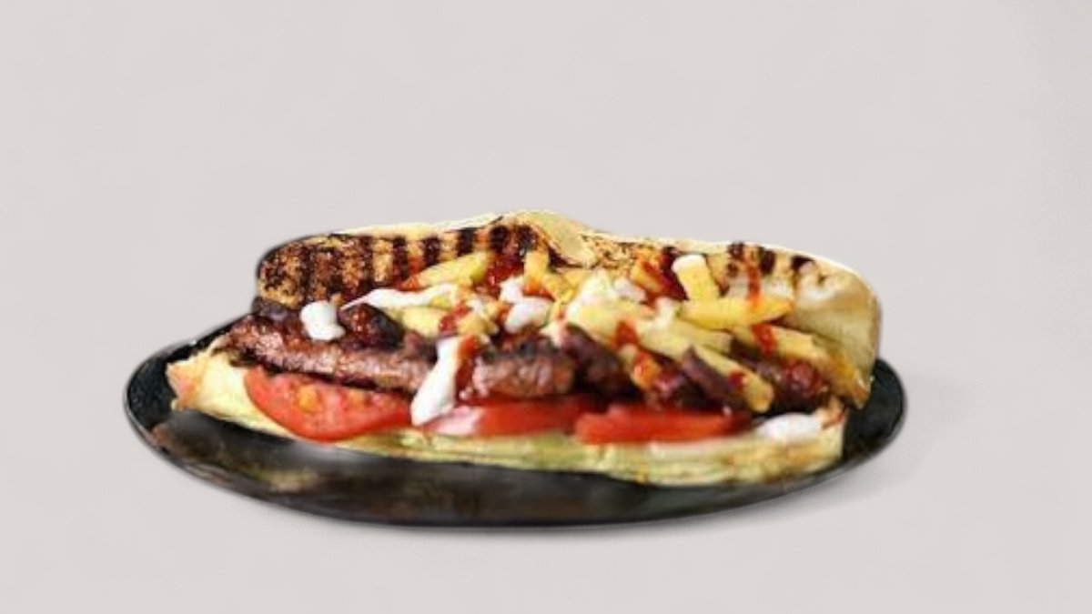 Με μπιφτέκι από ανάμεικτο κιμά (από 50% μοσχαρίσιο κιμά και 50% χοιρινό κιμά). Συνοδεύεται από πατάτες τηγανητές, πίτες, σως μουστάρδας και τζατζίκι