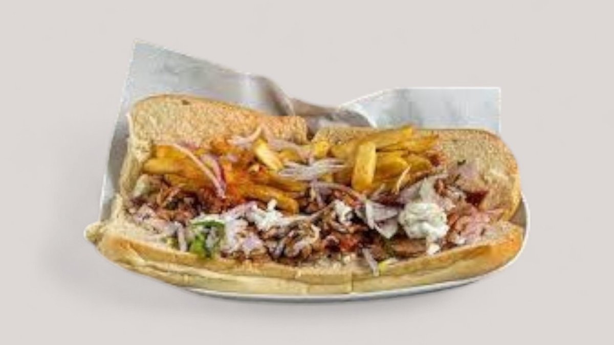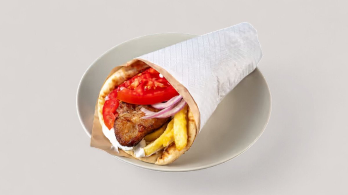 Με γύρο χοιρινό, ντομάτα, μαρούλι, κρεμμύδι, gouda και τζατζίκι. Συνοδεύεται από πατάτες τηγανητές