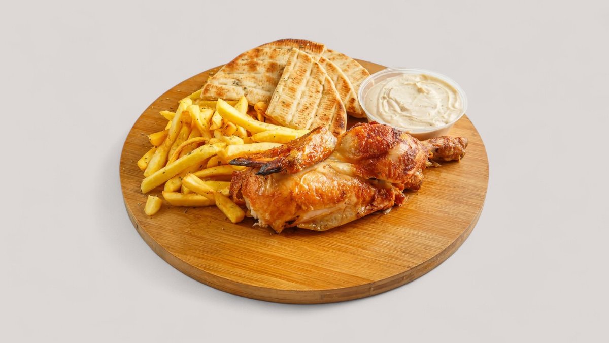 Συνοδεύεται από πατάτες τηγανητές, πίτες και σως κοτόπουλο