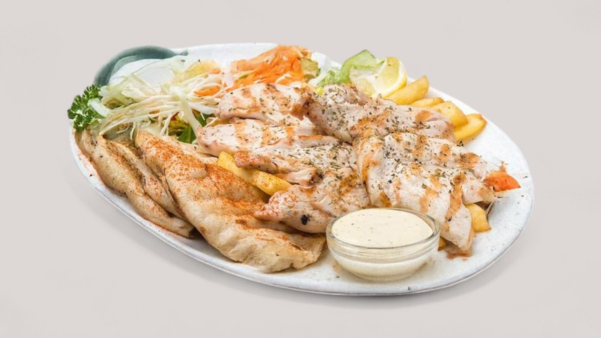 3 Τεμάχια. Συνοδεύεται από πατάτες τηγανητές, πίτες, σως μουστάρδας και τζατζίκι