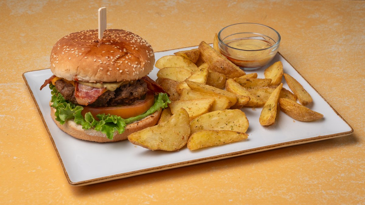 Μαρούλι, ντομάτα, cheddar, μπέικον, σως barbeque, καραμελωμένο κρεμμύδι, *αυγό (προαιρετικά)