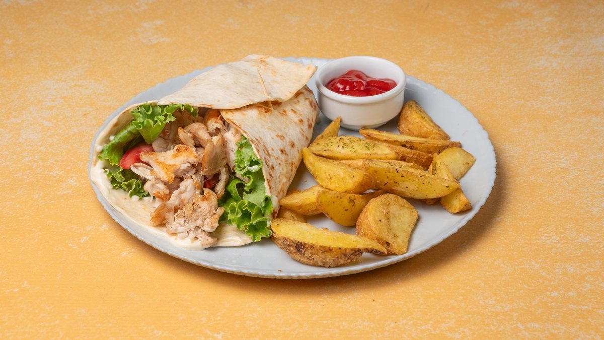 Κοτόπουλο πανέ, μαρούλι, ντομάτα, ροζ σως, κόλσλοου (λάχανο, κρεμμύδι, μαγιονέζα, κέτσαπ)