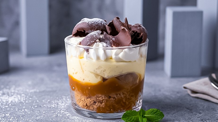 Ισορροπία ανάμεσα σε μπανάνα, καραμέλα και μπισκότο σε ένα απολαυστικό layering.