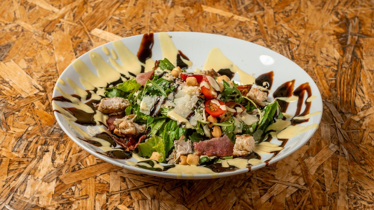 Μαρούλι, ρόκα, λόλα, ντοματίνι, κοτόπουλο, μπέικον, κρουτόν, dressing,κρέμα βαλσάμικου