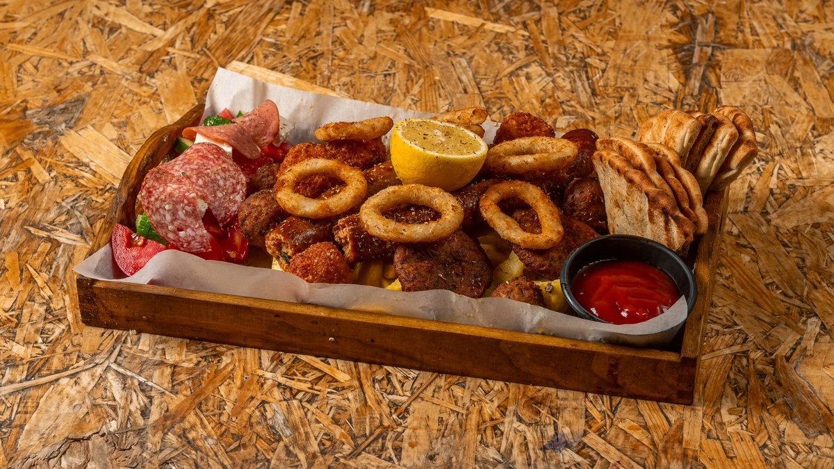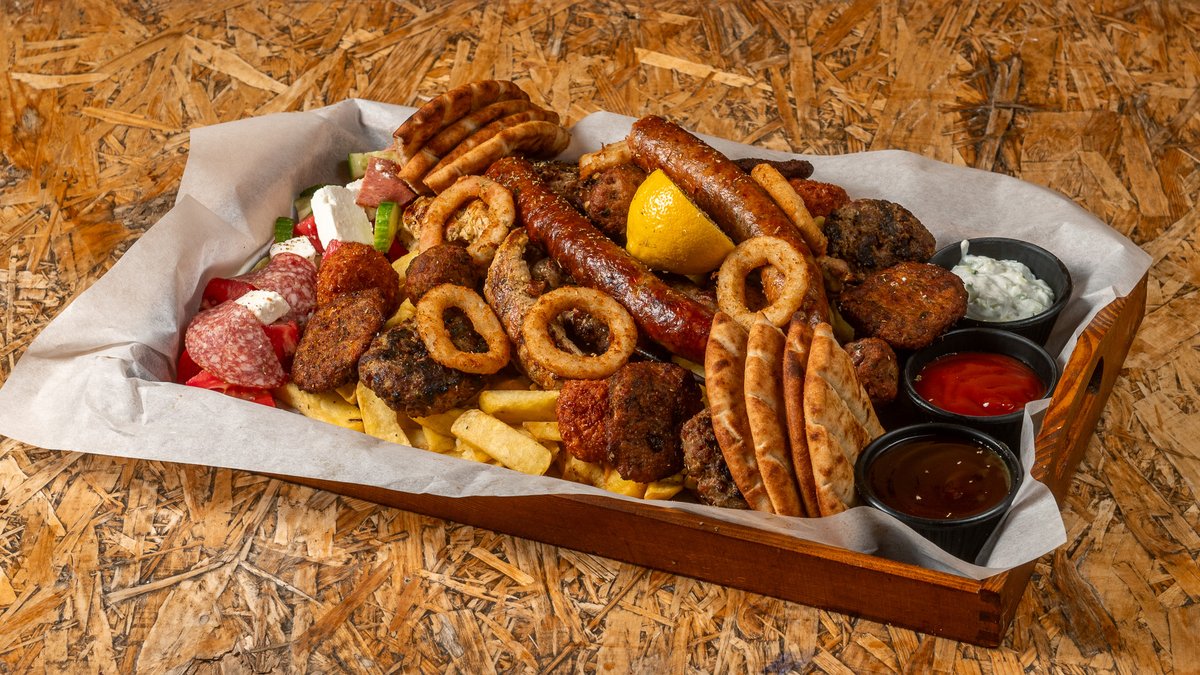Χοιρινά καλαμάκια, στήθη κοτόπουλο, λουκάνικο, μπιφτέκια, κολοκυθοκεφτέδες, κεφτεδάκια, τυροκροκέτες, onion rings, πατάτες, σαλάτα, πίτα, αλλαντικά, τυριά, BBQ sauce, τυροκαυτερή, τζατζίκι