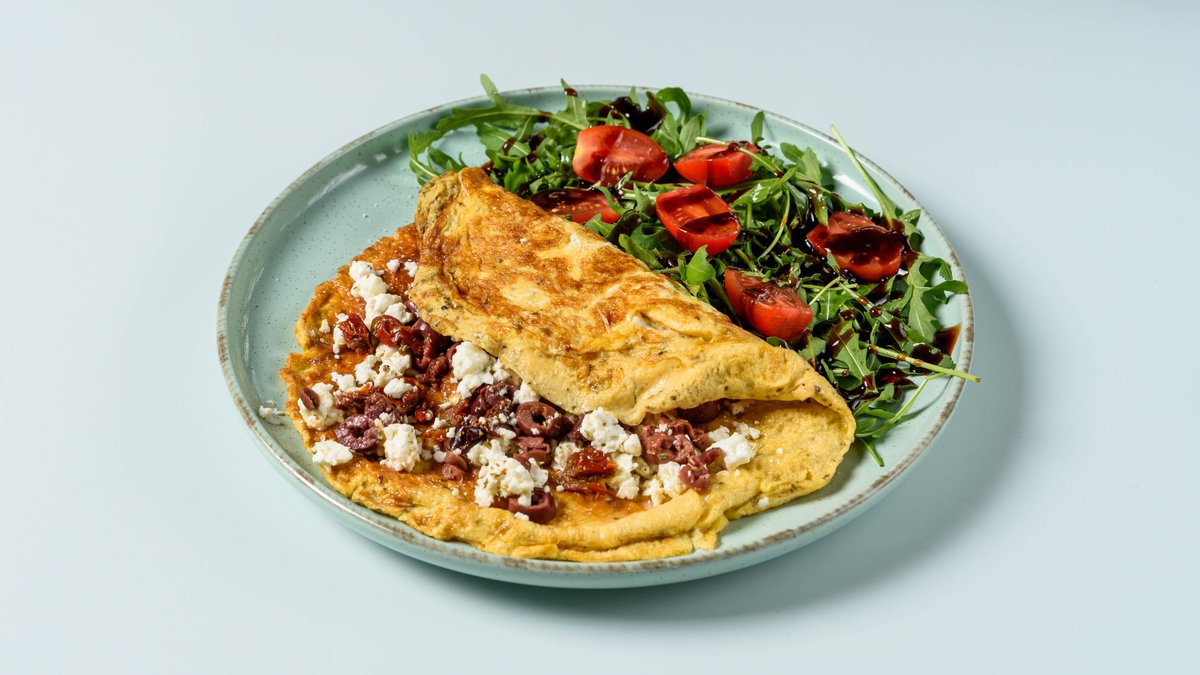 Με φέτα, ελιές και λιαστή ντομάτα. Συνοδεύεται από πράσινη σαλάτα
