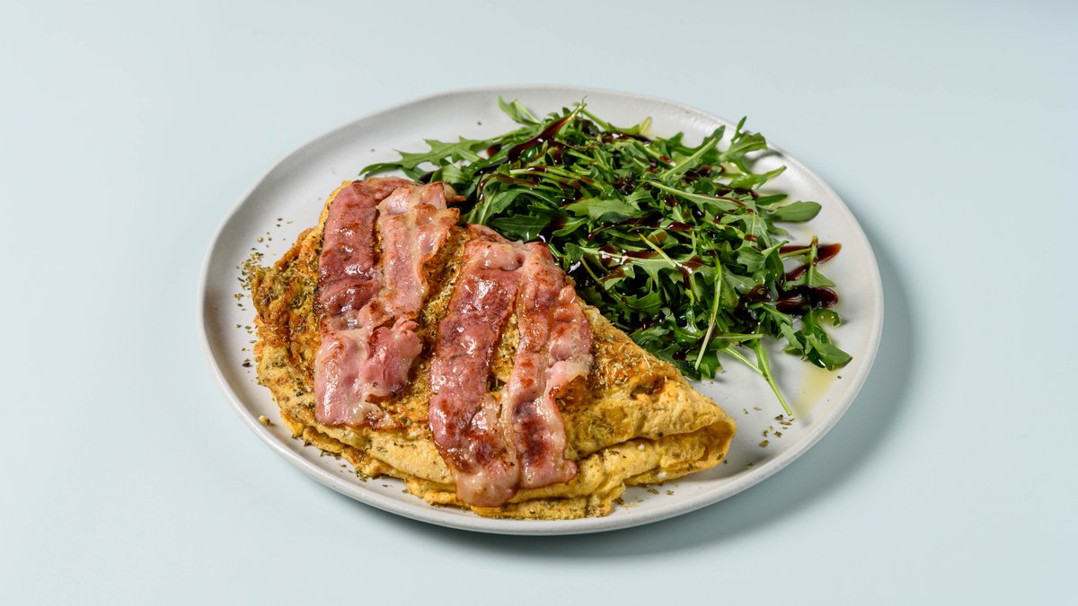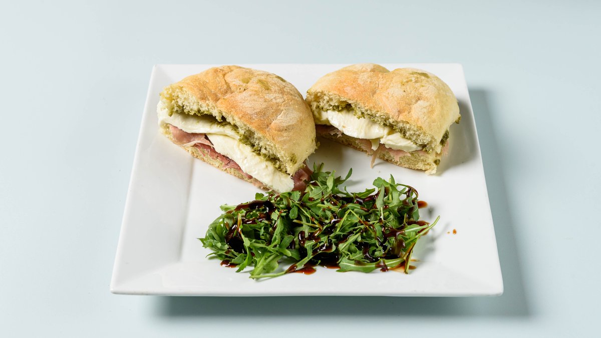 Με prosciutto, mozzarella, ντοματίνια και pesto βασιλικού. Συνοδεύεται από ρόκα και ντοματίνια