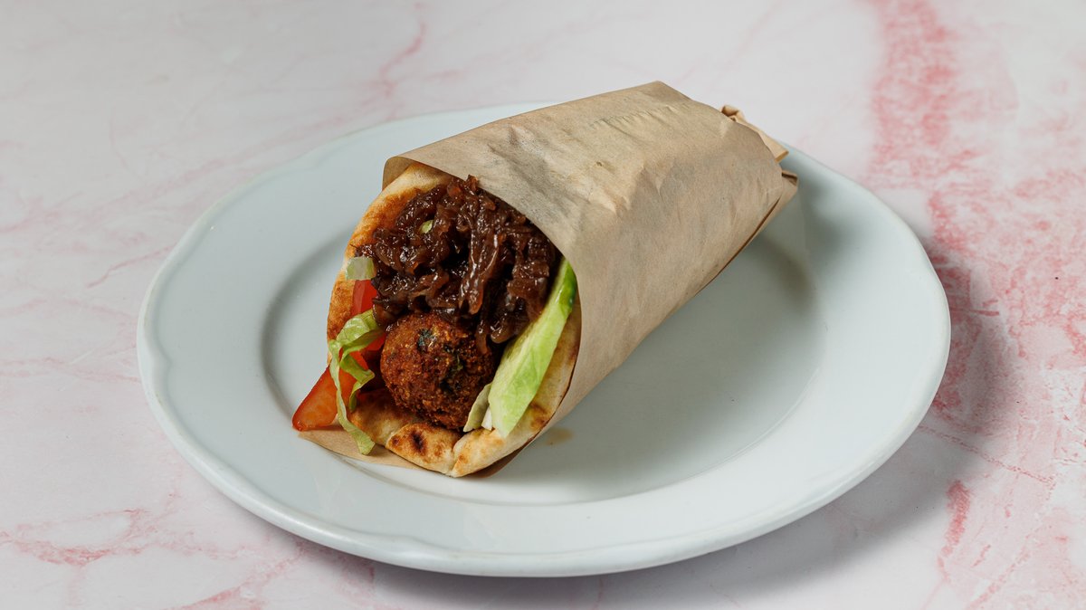 Με ντομάτα, αγγούρι, iceberg και καραμελωμένο κρεμμύδι