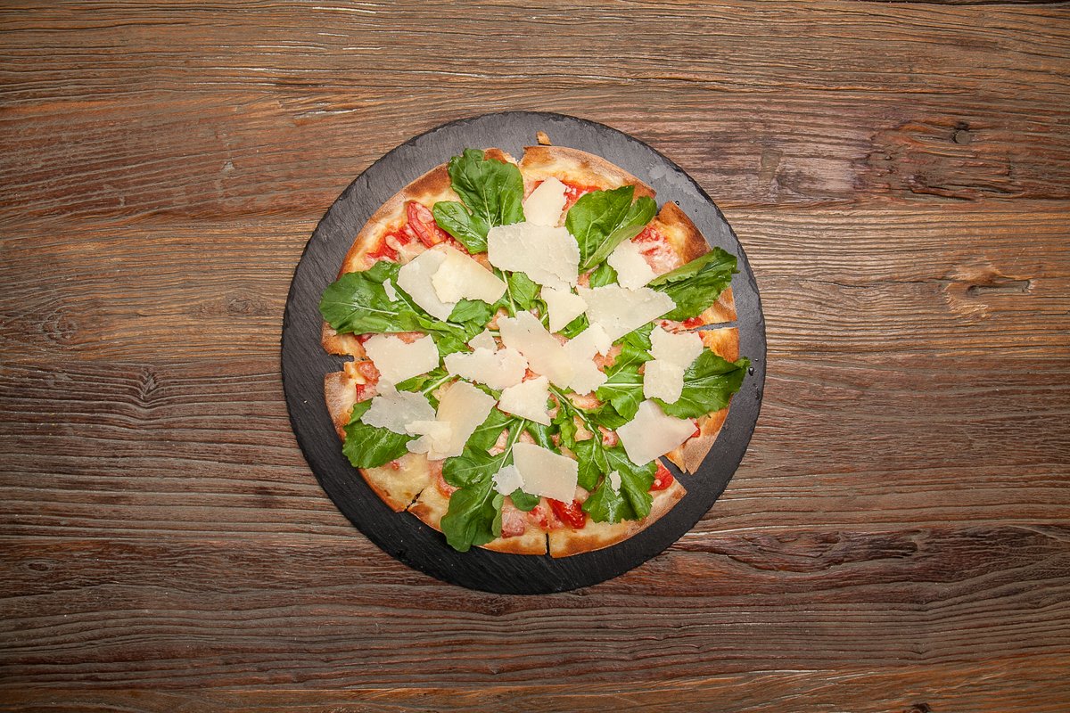 Με καπνιστή πανσέτα, λάδι τρούφας, mozzarella, flakes Parmigiano Reggiano, ανάμεικτα μανιτάρια και σάλτσα με κομματάκια φρέσκιας ντομάτας