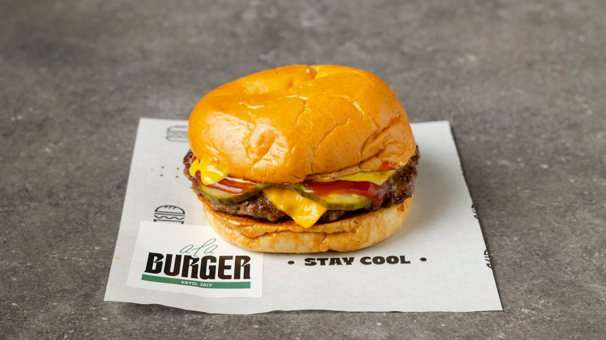 Με μπιφτέκι μοσχαρίσιο 100% 120 g, τυρί cheddar, homemade πίκλα, κέτσαπ και μουστάρδα