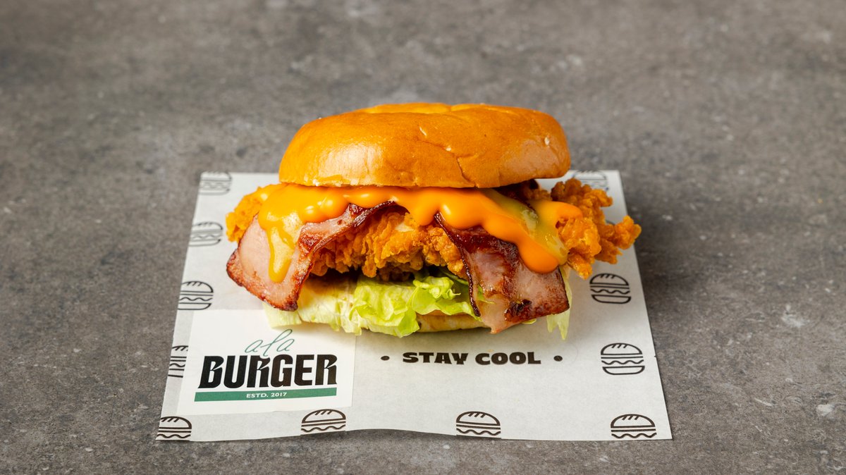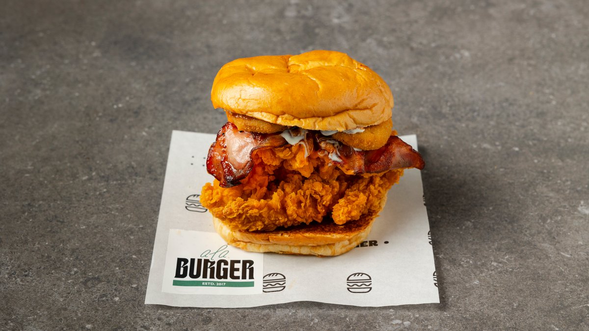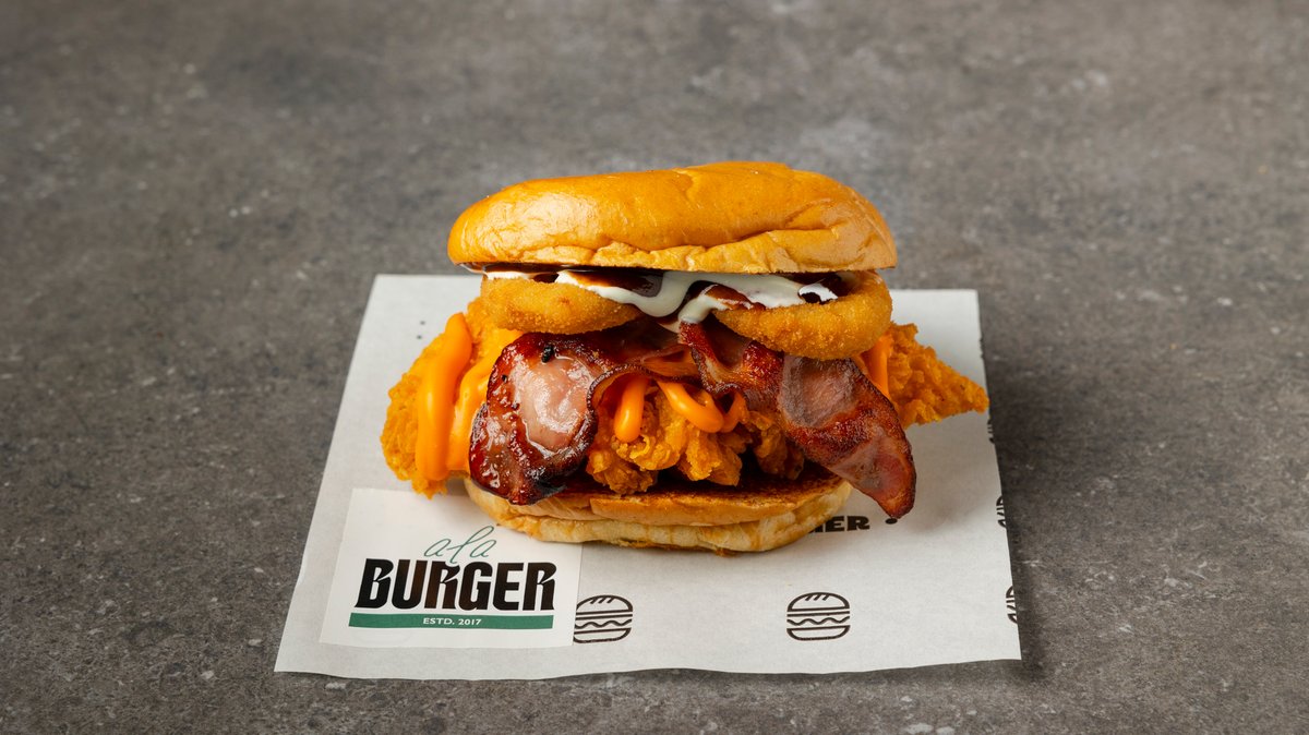 Με τηγανητό κοτόπουλο, cheddar, μπέικον, onion rings, bbq sauce, aioli sauce