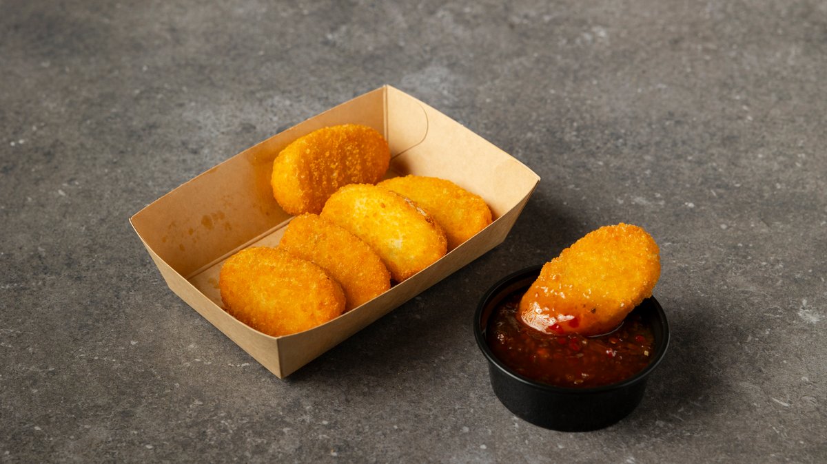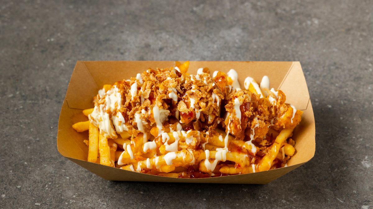 Μπουκιές απο τηγανητό φιλέτο κοτόπουλο πάνω σε φρεσκοτηγανησμένες πατάτες. Συνοδεύεται με aioli sauce, sweet chilli sauce και flakes απο τηγανητό κρεμμύδι