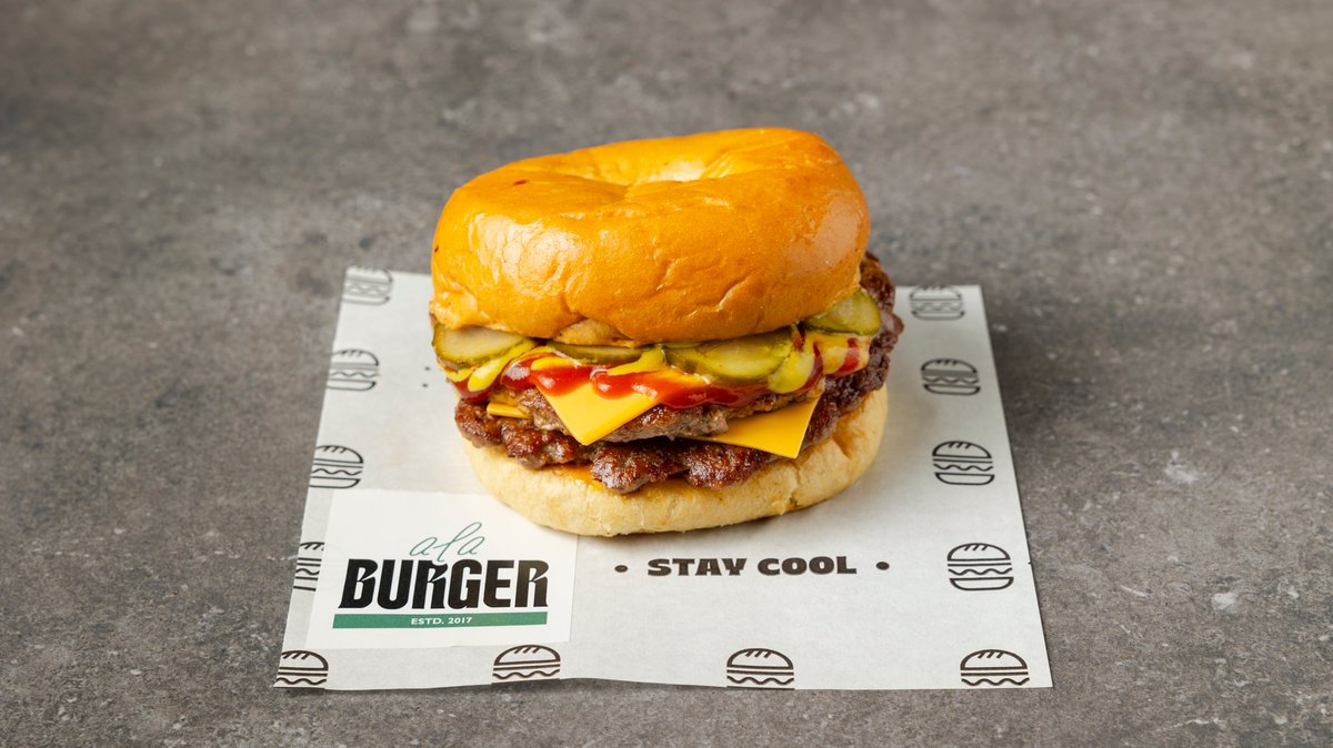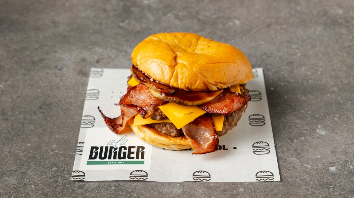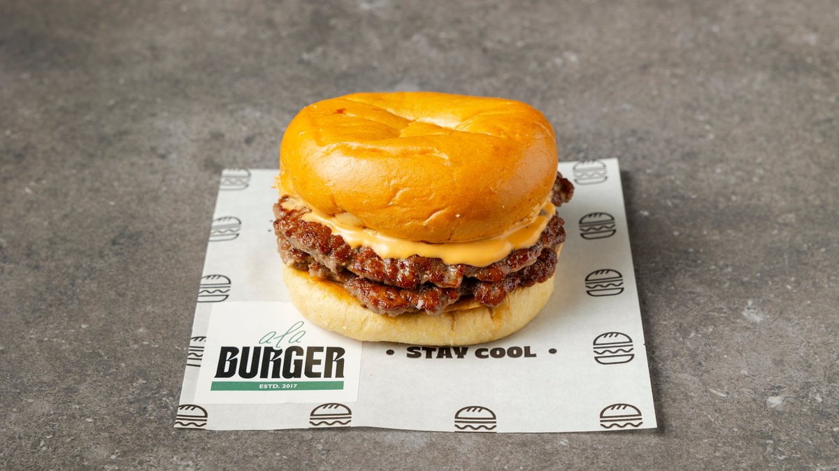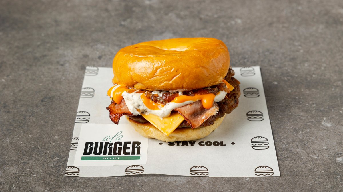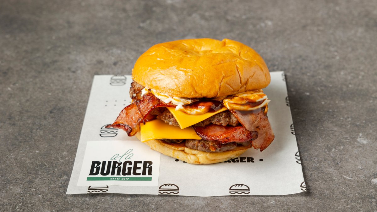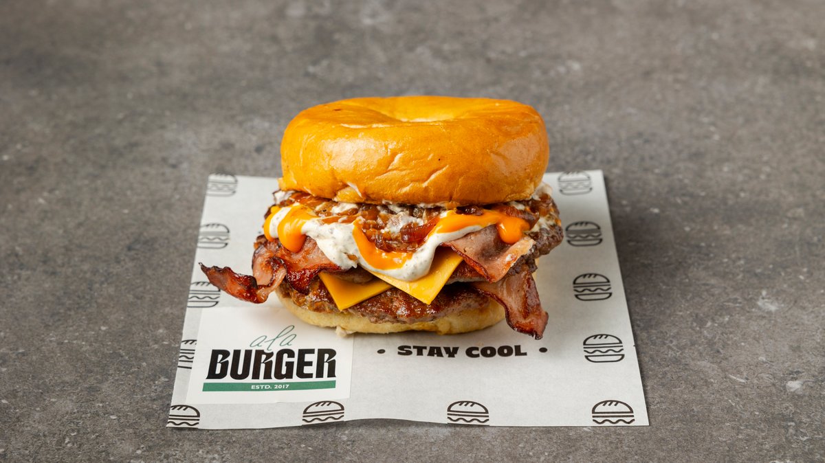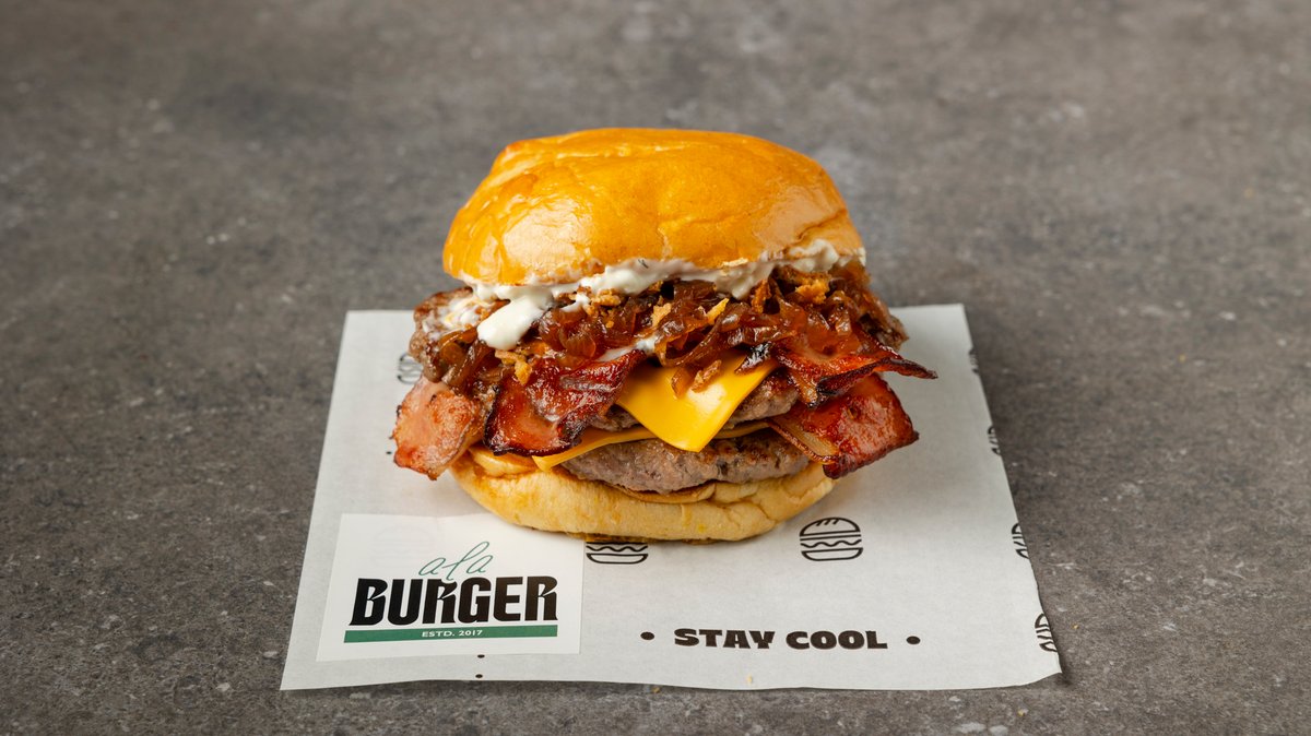 Με μπιφτέκι από 100% μοσχαρίσιο κιμά (120 g), διπλό τσένταρ, κρεμώδη cheddar, διπλό bacon, καραμελωμένα κρεμμύδια, μαγιονέζα τρούφας