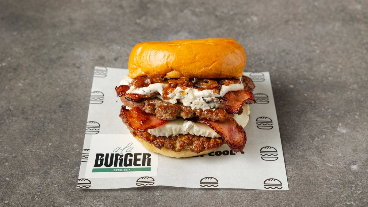 Με μπιφτέκι από 100% μοσχαρίσιο κιμά (240 g), cheddar, τραγανό μπέικον, τηγανητά κρεμμύδια καραμελωμένα και blue cheese sauce.