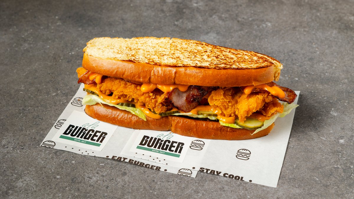 Ψωμάκι brioche με τηγανητό φιλέτο, cheddar, μπέικον, sweet corn, crispy onions, bbq sauce