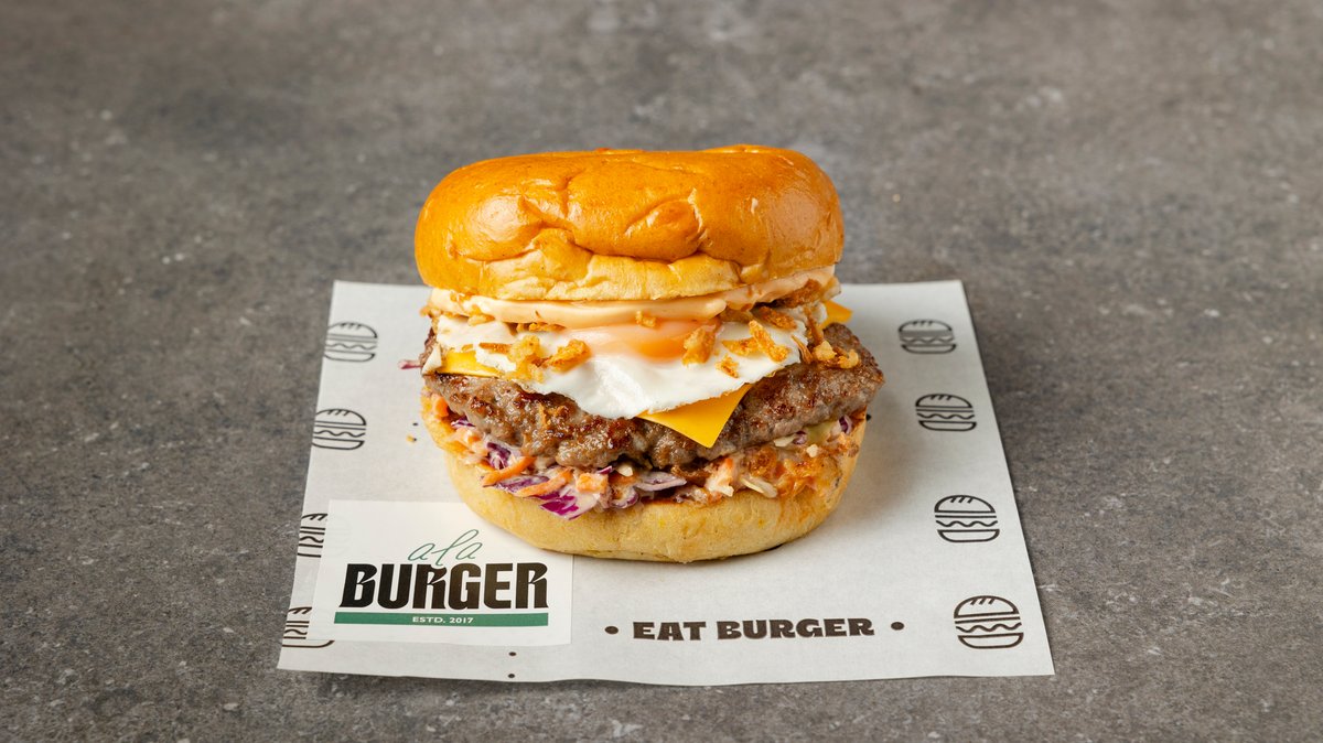 Με μπιφτέκι από 100% μοσχαρίσιο κιμά (120 g), διπλό τσένταρ, αυγό τηγανητό, coleslaw, crispy onions, sriracha mayo