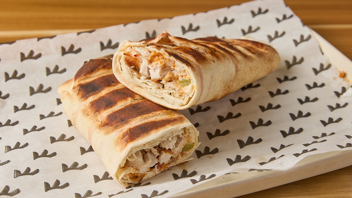 Αραβική πίτα, κοτόπουλο, πίκλες, σως σκόρδου, πικάντικη σως (λίγο καυτερή)