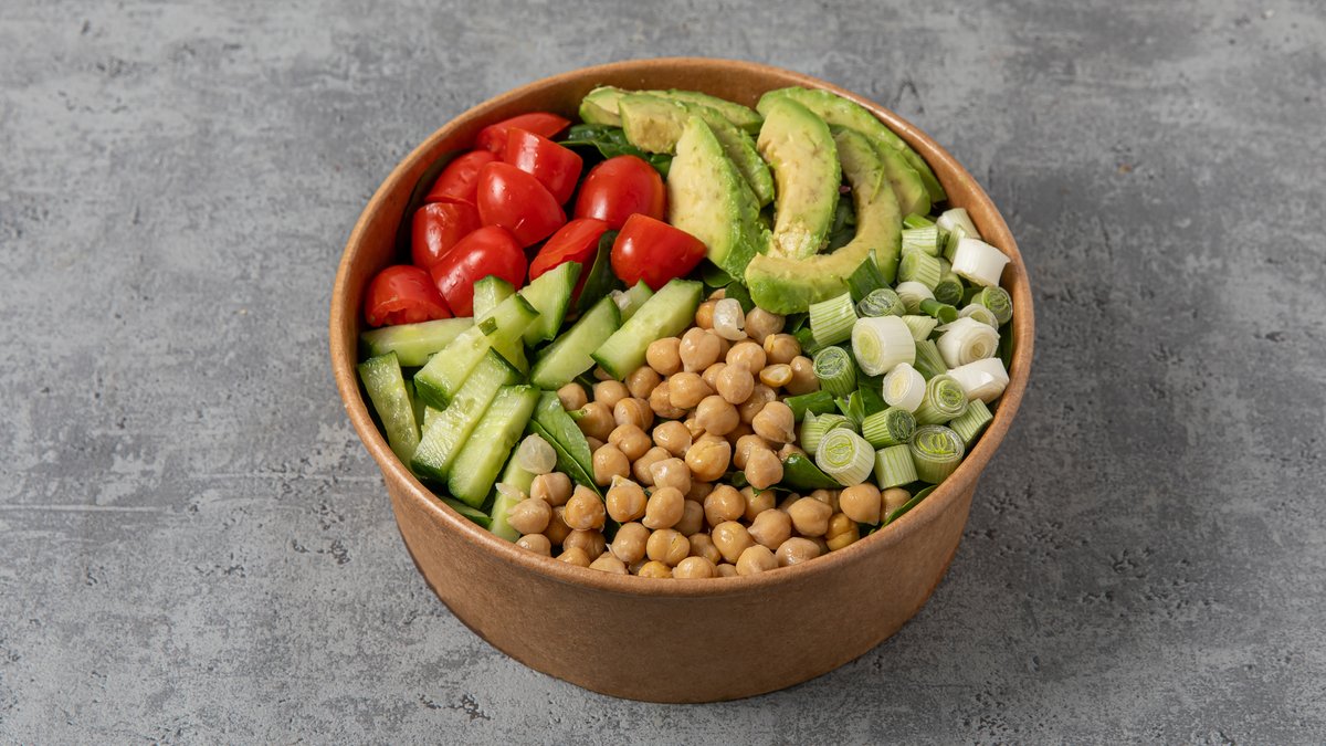 Με ρεβίθια, αγγούρι, αβοκάντο, φρέσκο κρεμύδι, ντοματίνια, baby σπανάκι και ρόκα. Συνοδέυεται με σως