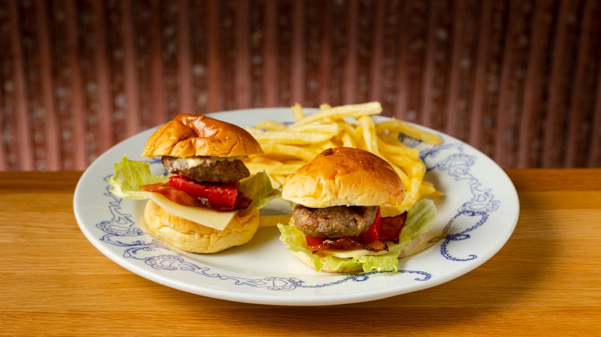 Μοσχαρίσιο burger, iceberg, τομάτα, γραβιέρα Κρήτης, bacon, πίκλες, καραμελωμένα κρεμμύδια, μαγιονέζα, πατάτες τηγανητές.
