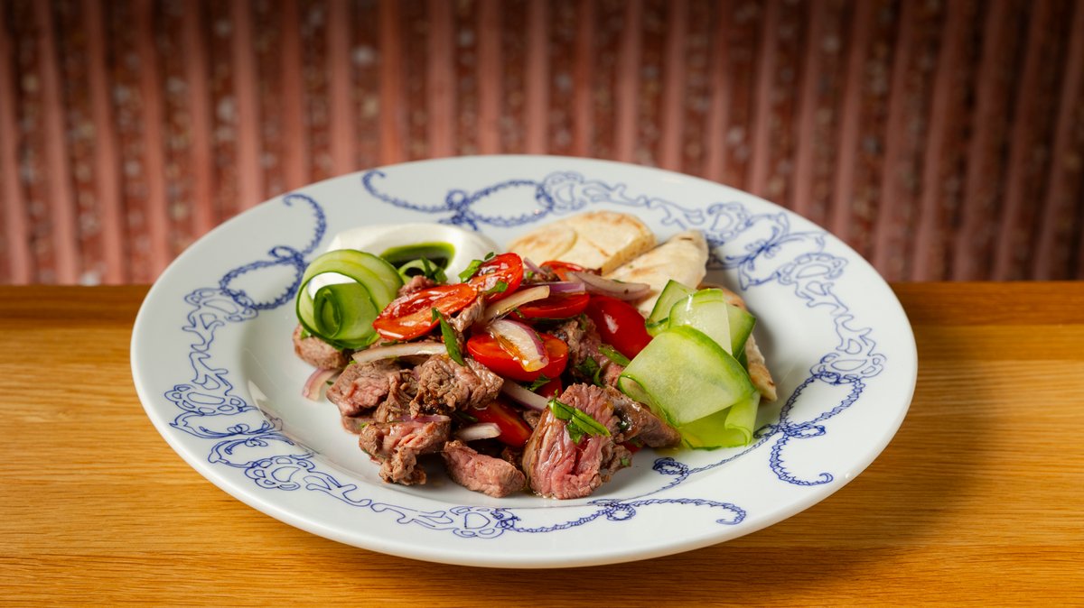 Με μοσχαρίσιο χτένι, αγγούρι, ντοματίνια, μαϊντανό, κρεμμύδι, γιαούρτι και πίτα χειροποίητη