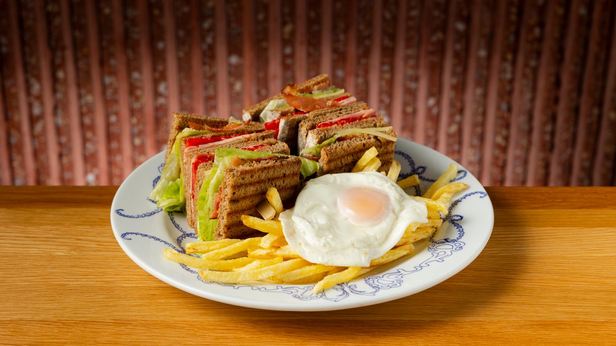 Ψωμί ολικής άλεσης, ζαμπόν, τυρί αγελαδινό, bacon, ντομάτα, μαρούλι, μαγιονέζα και πατάτες τηγανητές