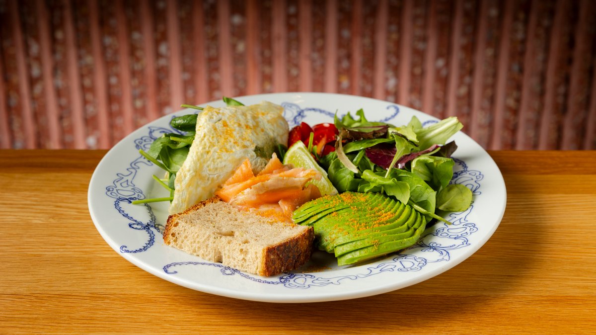 Με 3 ασπράδια αυγών, σπανάκι, avocado και καπνιστό σολομό. Συνοδεύεται από σαλάτα με ανάμεικτα πράσινα λαχανικά, ντοματίνια και ψωμί προζυμένιο της επιλογής σας