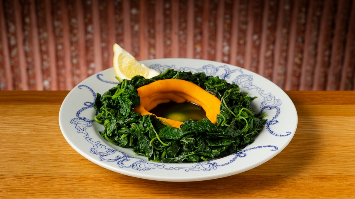 Χόρτα εποχής, πουρές γλυκοπατάτας, ελαιόλαδο, ανθός αλατιού