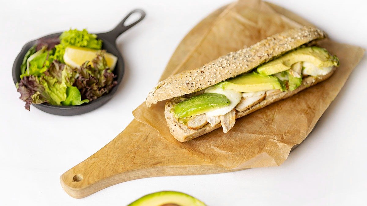 Πολύσπορο Ψωμί με φιλέτο κοτόπουλο, αβοκάντο, μοτσαρέλα και honey mustard sauce