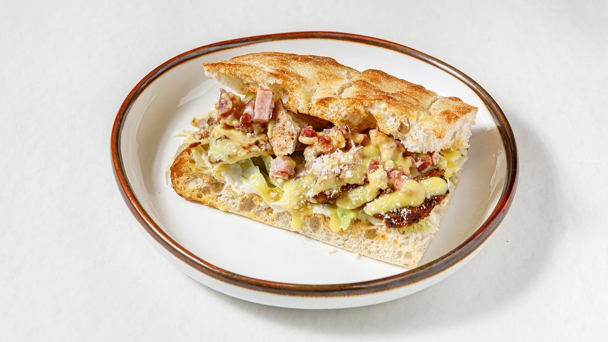 Παναρισμένο κοτόπουλο σε foccacia με bacon, παρμεζάνα iceberg και caesars sauce