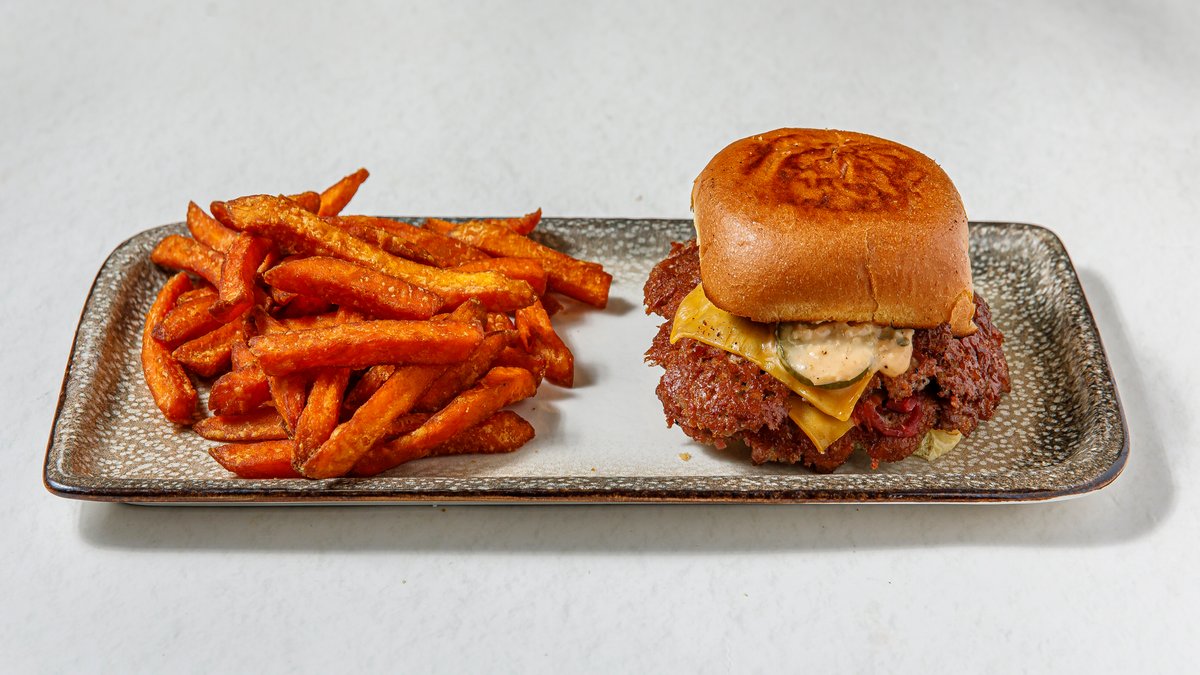 Ψωμάκι potato bun με 2 μπιφτέκια μοσχαρίσια black angus (100 γρ/τμχ) , καραμελωμένα κρεμμύδια, , cheddar , αγγουράκι τουρσί και tartare sauce. Συνοδεύεται από γλυκοπατάτες
