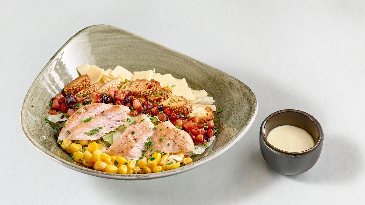 Κοτόπουλο, iceberg, κρουτόν από κουλούρι Θεσσαλονίκης, μπέικον, flakes γραβιέρας, καλαμπόκι, caesar sauce