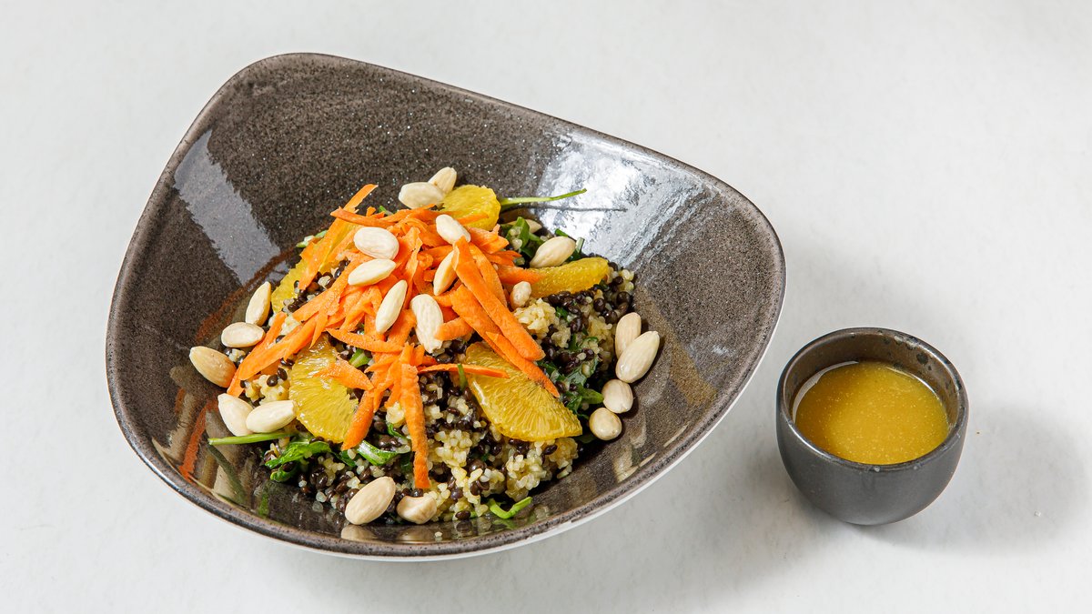 Δροσερή σαλάτα με πλιγούρι, φακές, πορτοκάλι, καρότο, ρόκα, αμύγδαλο, φρέσκο κρεμμύδι, κόλιανδρο με dressing βαλσάμικο