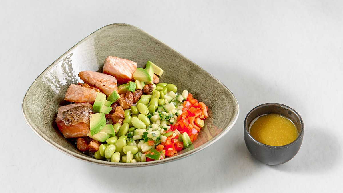 Τρυφερές μπουκιές σολωμού, ρύζι μπασμάτι, edamame, πολύχρωμες πιπεριές, αγγούρι, κάσιους, αβοκάντο, λαδολέμονο βασιλικού