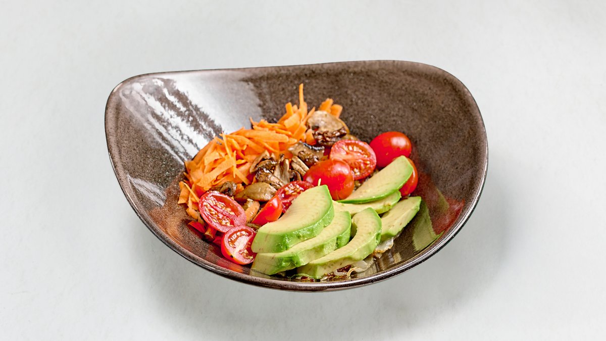 Με λάχανο, μανιτάρια, αβοκάντο, καρότο και ντοματίνια με το dressing της επιλογής σου
