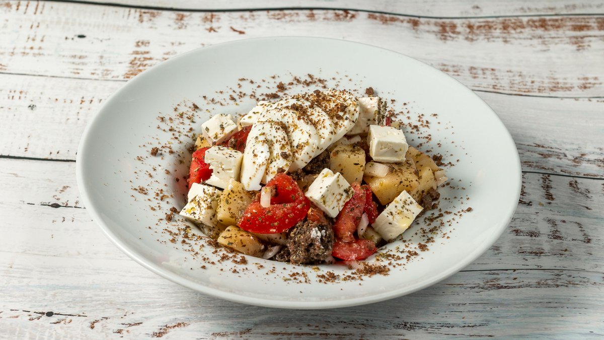 Παραδοσιακή σαλάτα Κρήτης με ντομάτα, πατάτα βραστή, αυγό, φέτα, κρεμμύδι και παξιμάδια με χαρουπόμελο και βινεγκρέτ από μηλόξιδο
