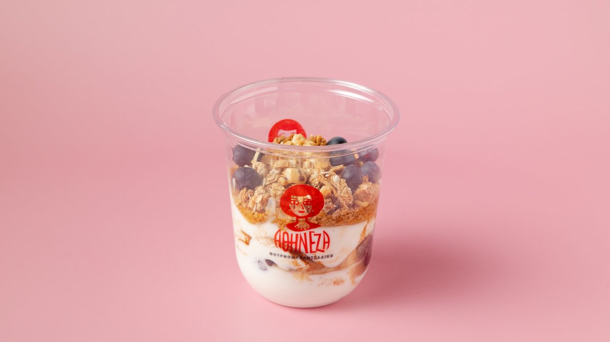 Γιαούρτι 2% λιπαρών, γκρανόλα βρώμης και ξηρώνν καρπών, αποξηραμένα κράνμπερις, φρέσκα μπλούμπερις, φρέσκια μπανάνα, σκόνη κανέλα, μέλι ανθέων