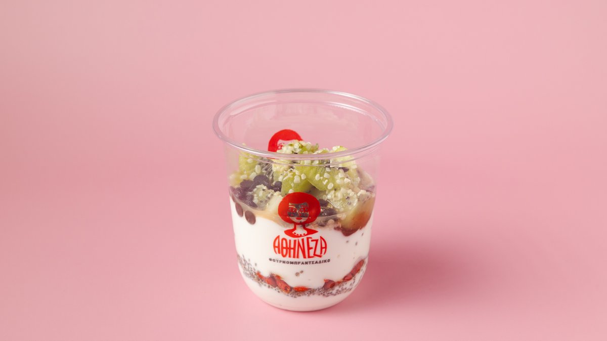 2% γιαούρτι λιπαρών, σπόρους κάνναβης, σπόρους τσία, γκότζι μπέρι, φρέσκια φράουλα, σταγόνες σοκολάτας, μαρμελάδα φράουλας 0% λιπαρά