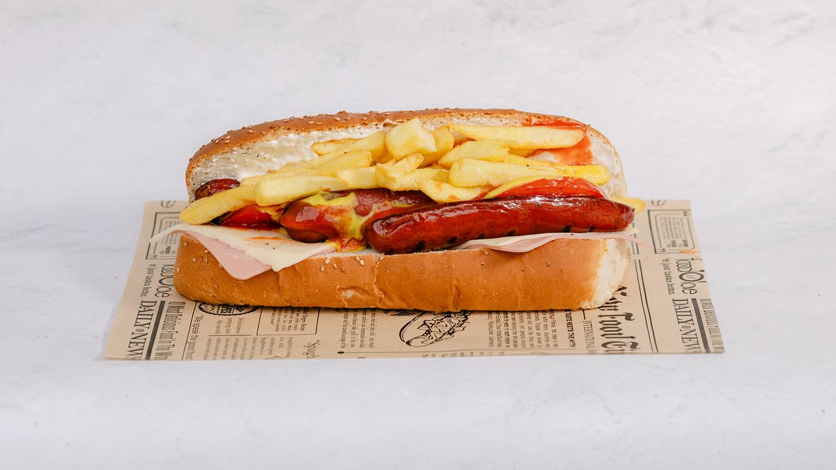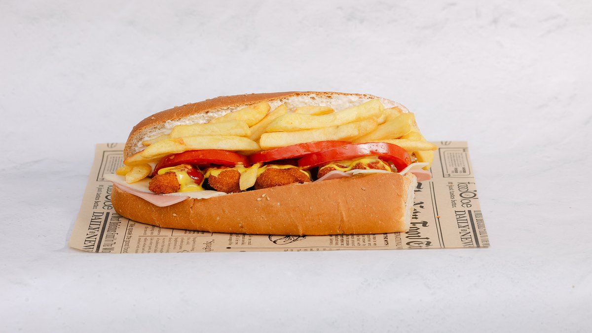 Με gouda, πάριζα, τυροσαλάτα, μαγιονέζα, πατάτες τηγανητές, ντομάτα, μουστάρδα, κέτσαπ, λεμόνι και αλάτι